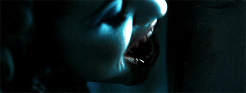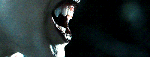 Ariel moves Trish’s hair to the side. Ariel mouth opens to expose her fangs growing in her mouth.