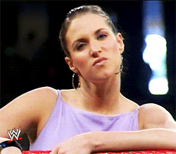 Stephanie menacingly speaks into the mic, “I don’t hear you Paige! Maybe the rest of the world can hear you better and tell me what your saying.” Stephanie cockily shoves the mic into Paige’s kisser, not caring how hard she hits her mouth.