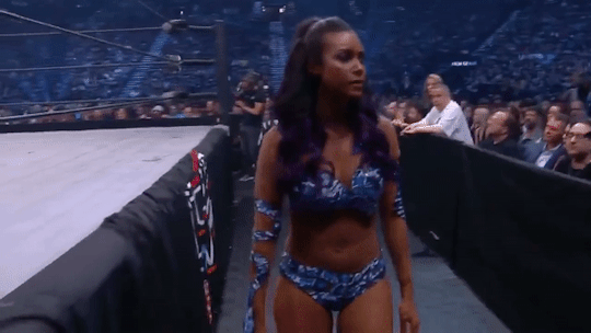 Both women are in the ring for this next match. Both are eager to get the match started as the ref tries to get both women to calm down before their match. The ref is rather eager to get this match started so that they can just ‘have at-it’ already.