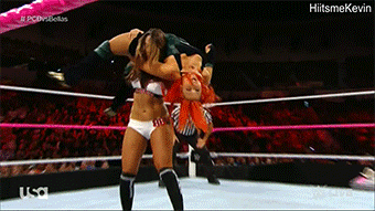 Nikki drags, the lifeless beauty to the middle of the ring and releases her so Bri can take over. She proceeds to head to the turnbuckle.