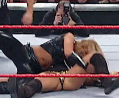 Trish’s knee is damaged from the running knee after it connected to the other side of the steel chair. The damage is done as Trish struggles to get to her feet. She falls back down unable to hold herself up. She holds her knee in excruciating pain.
