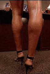 The camera follows the long legs of Stephanie. From the dress shoes, up her tanned legs. All the way up to her face.