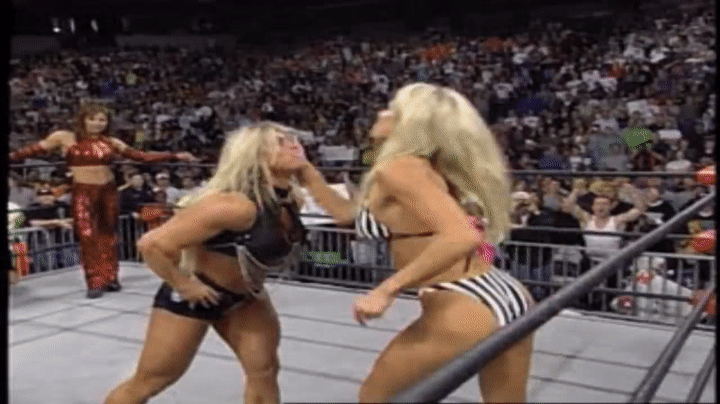 Scarlett makes a bold move and shoves Torrie Wilson onto her ass to a responsive crowd.