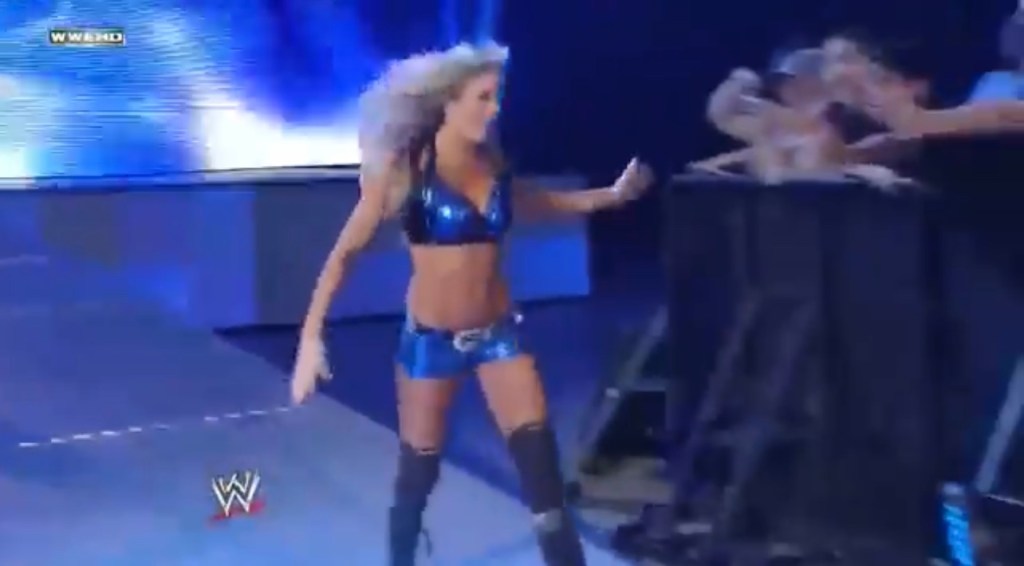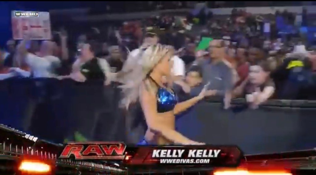 Kelly makes her way out to a negative reception. The crowd is still as raunchy as the night before and they’re hollering at the beautiful Kelly Kelly as she walks down the long aisle. Some in the audience are cheering her, as she has naturally built some goodwill with fans over the years.