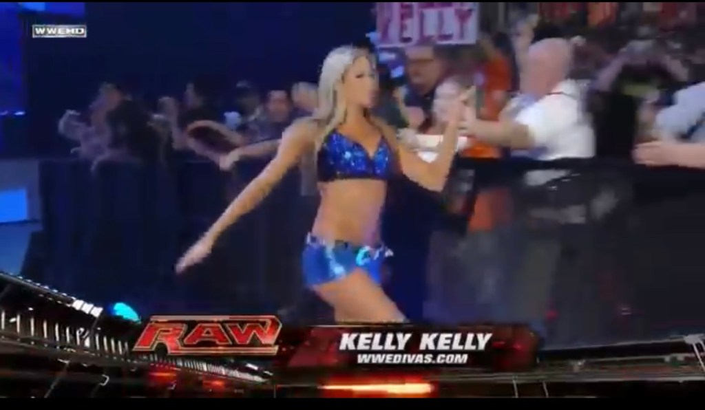 The lighting in the arena changes and the upbeat music of Kelly Kelly plays.