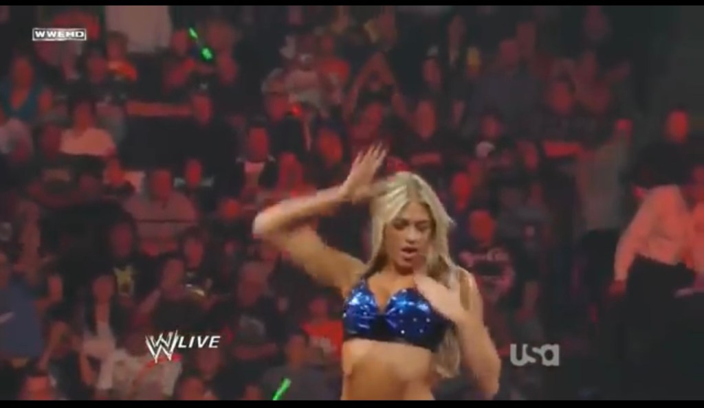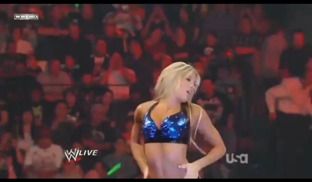 Ariande quickly introduces the combatants as she’s eager to see whos’ going to win too. “In this corner of the ring, is the master of the K-2, the Royal Rumble winner, winning from the number one spot, it’s former IC Champion… Kelly Kelly!”