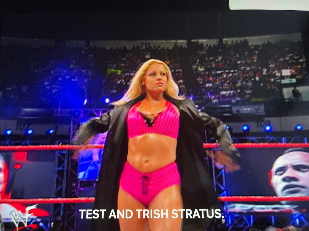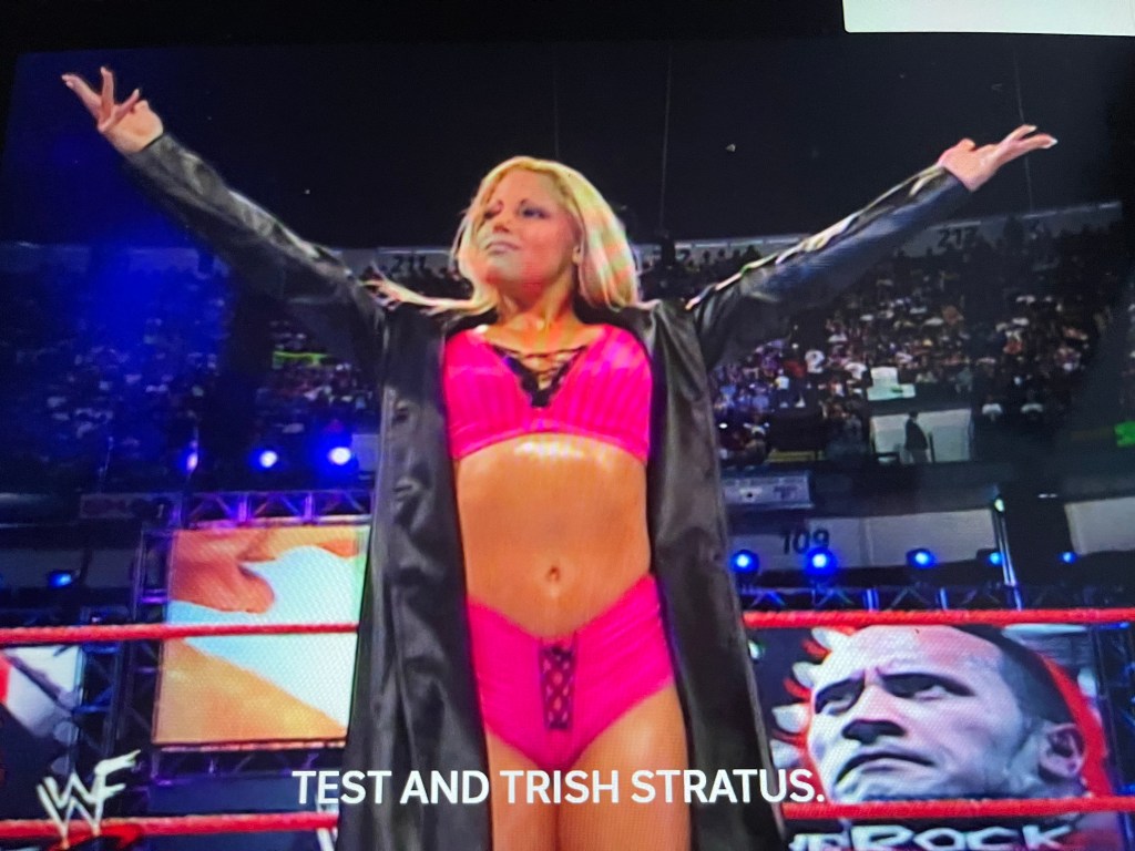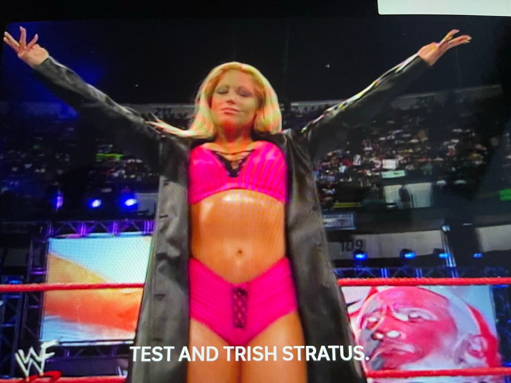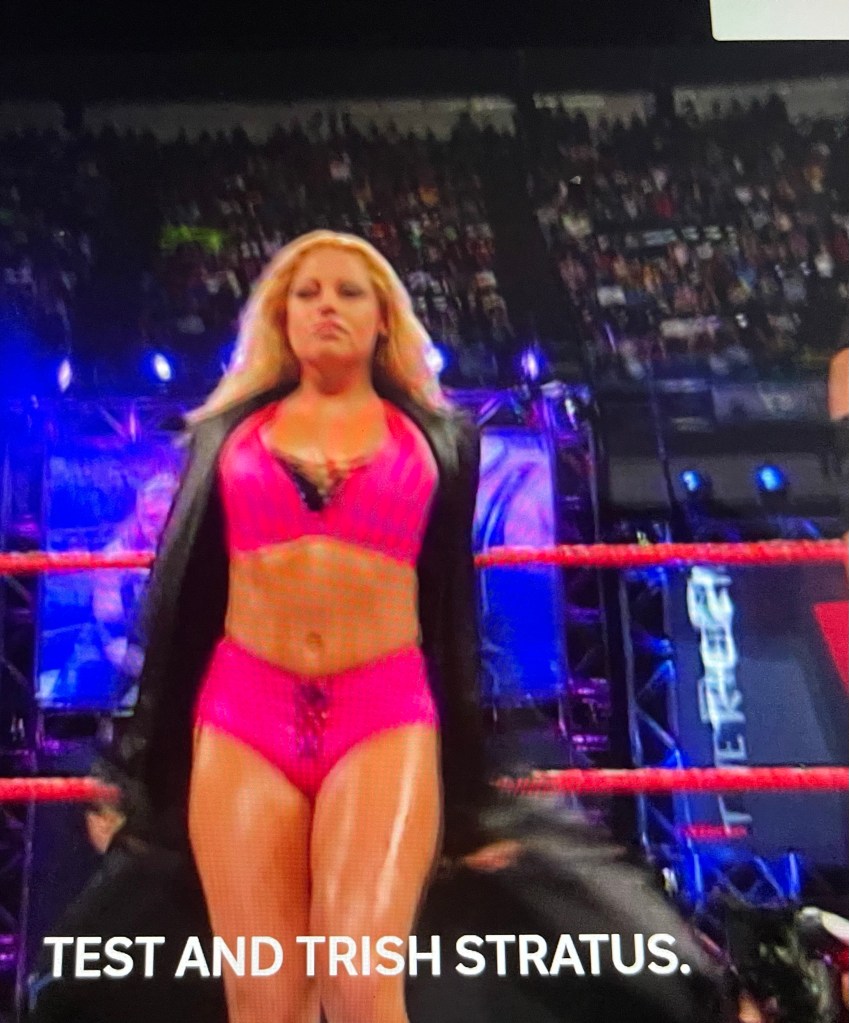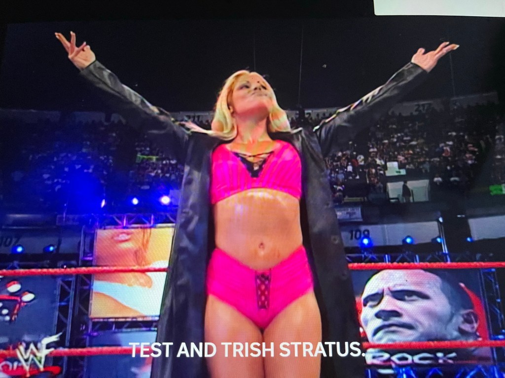 Just as she entered the ring, a familiar giggle echos throughout the building and almost chuckles at Kelly’s entrance. Trish’s theme music plays and the crowd goes apeshit.