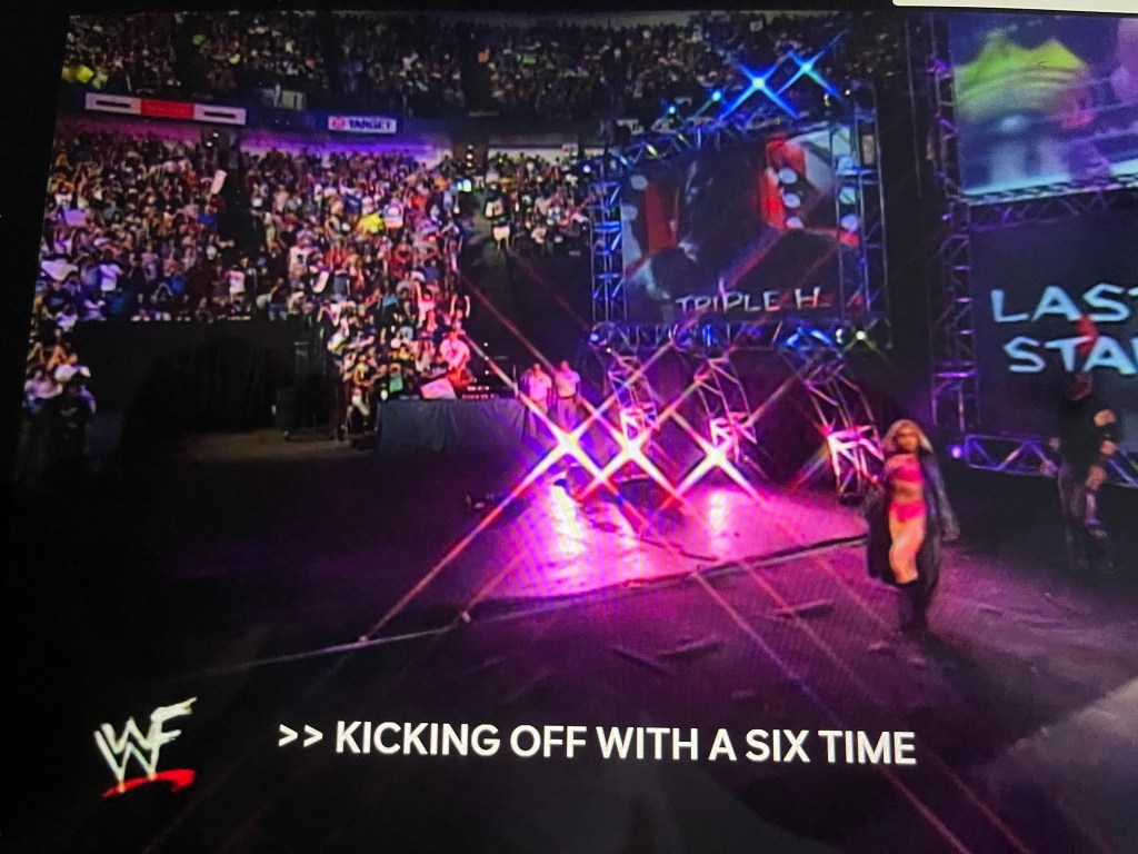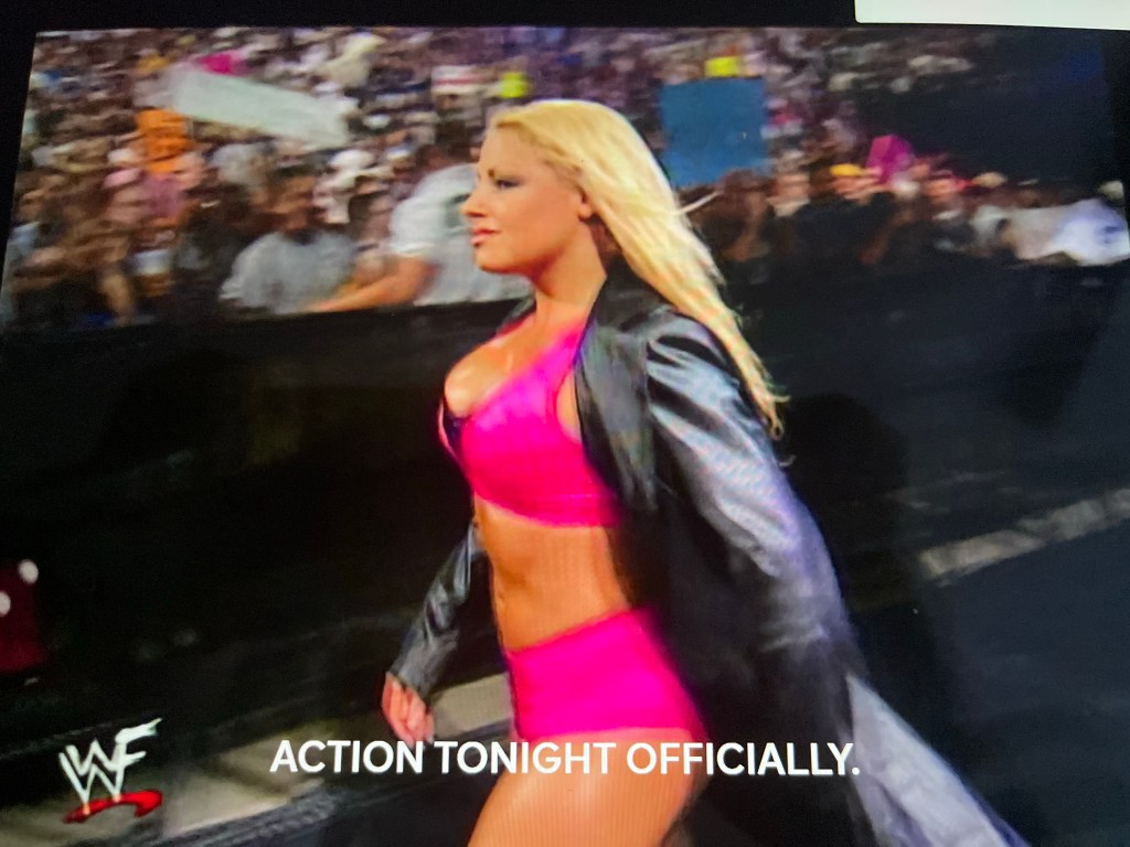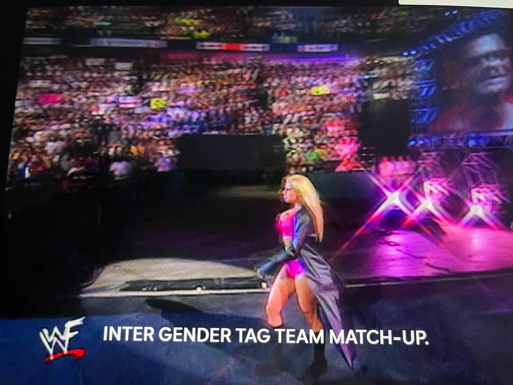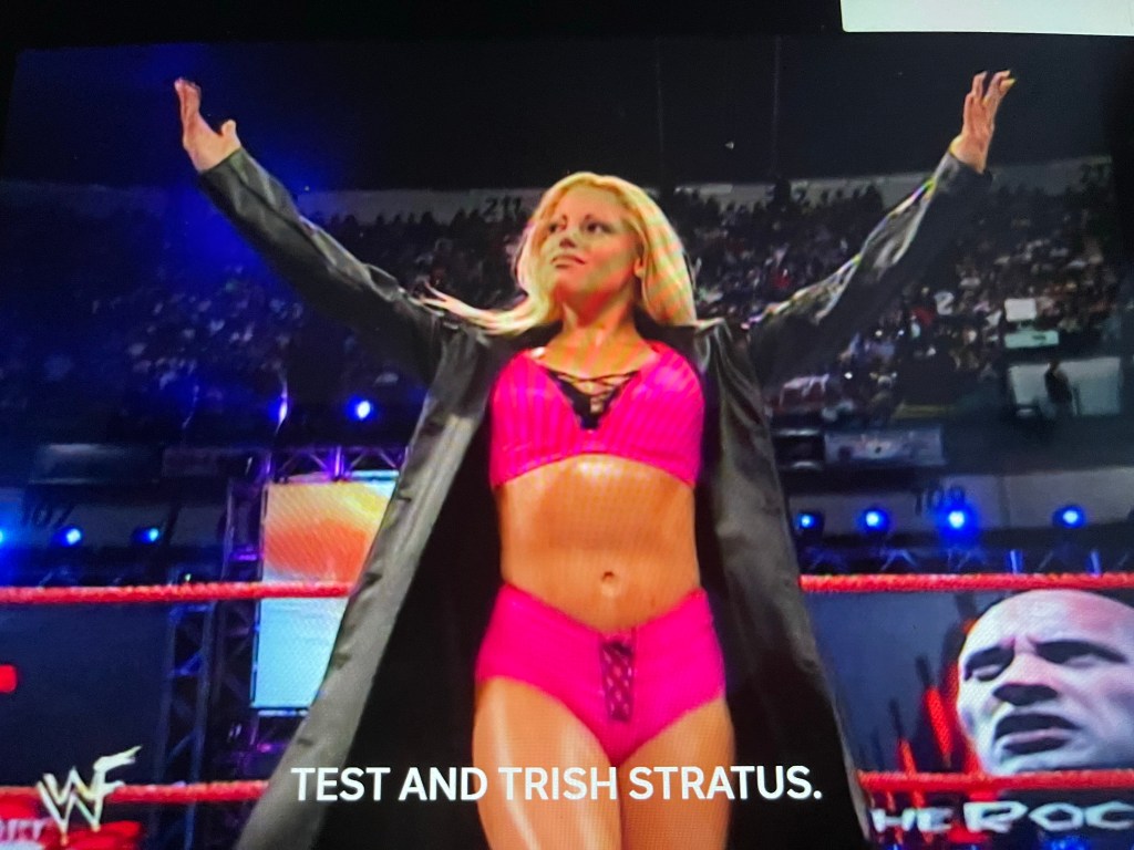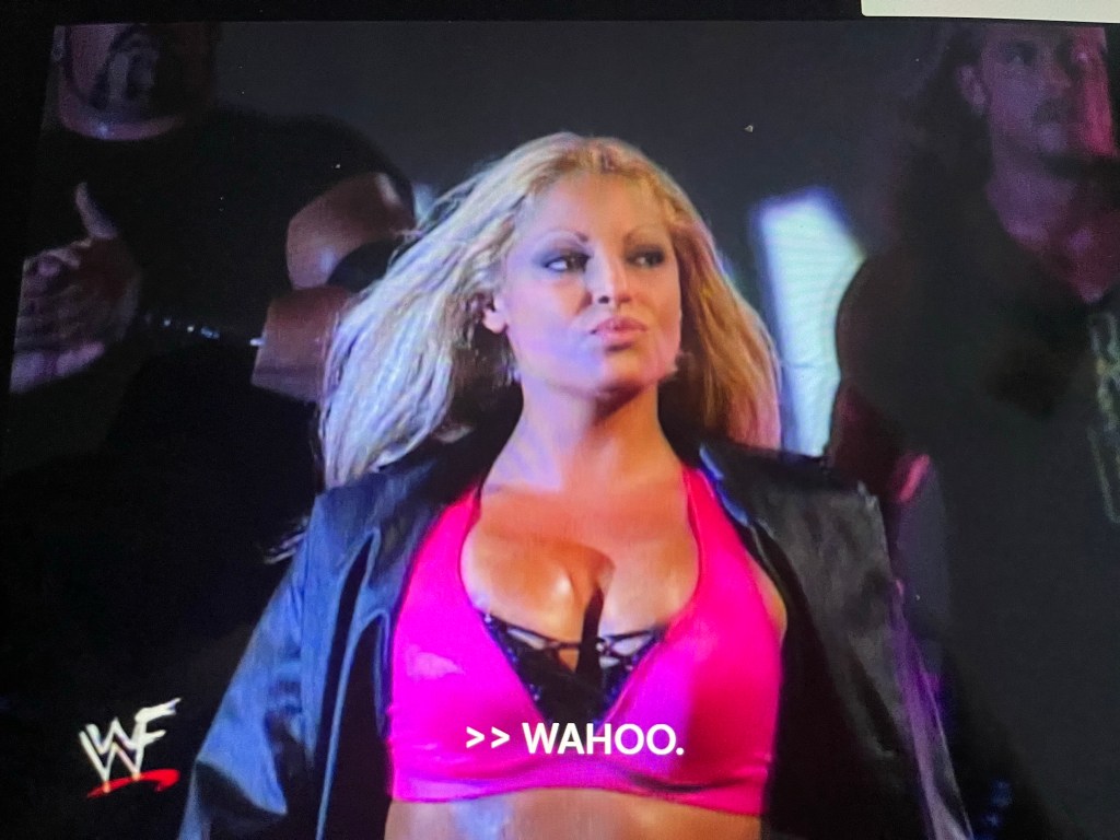 Just as she entered the ring, a familiar giggle echos throughout the building and almost chuckles at Kelly’s entrance. Trish’s theme music plays and the crowd goes apeshit.