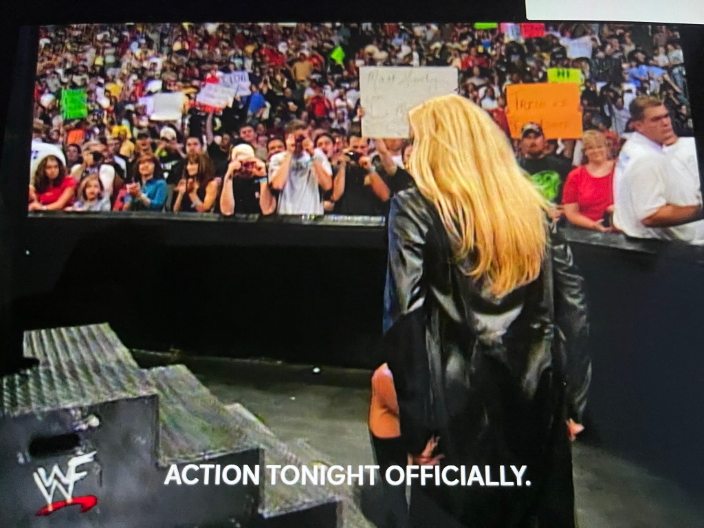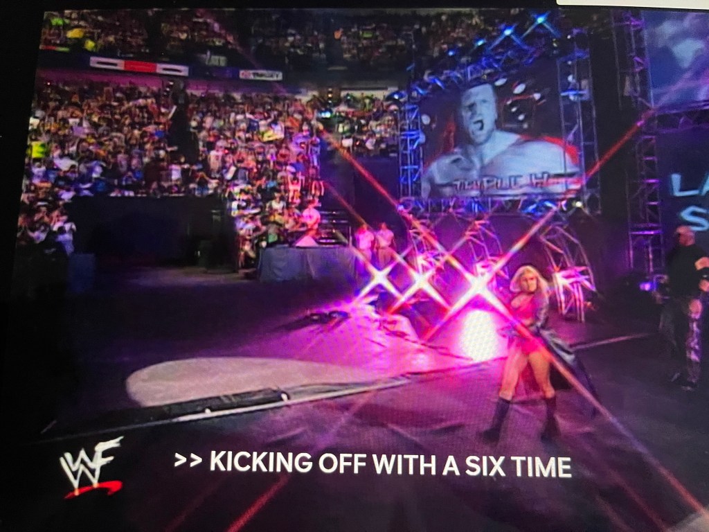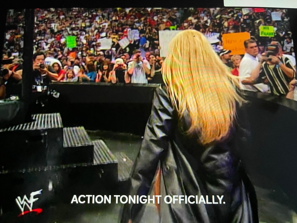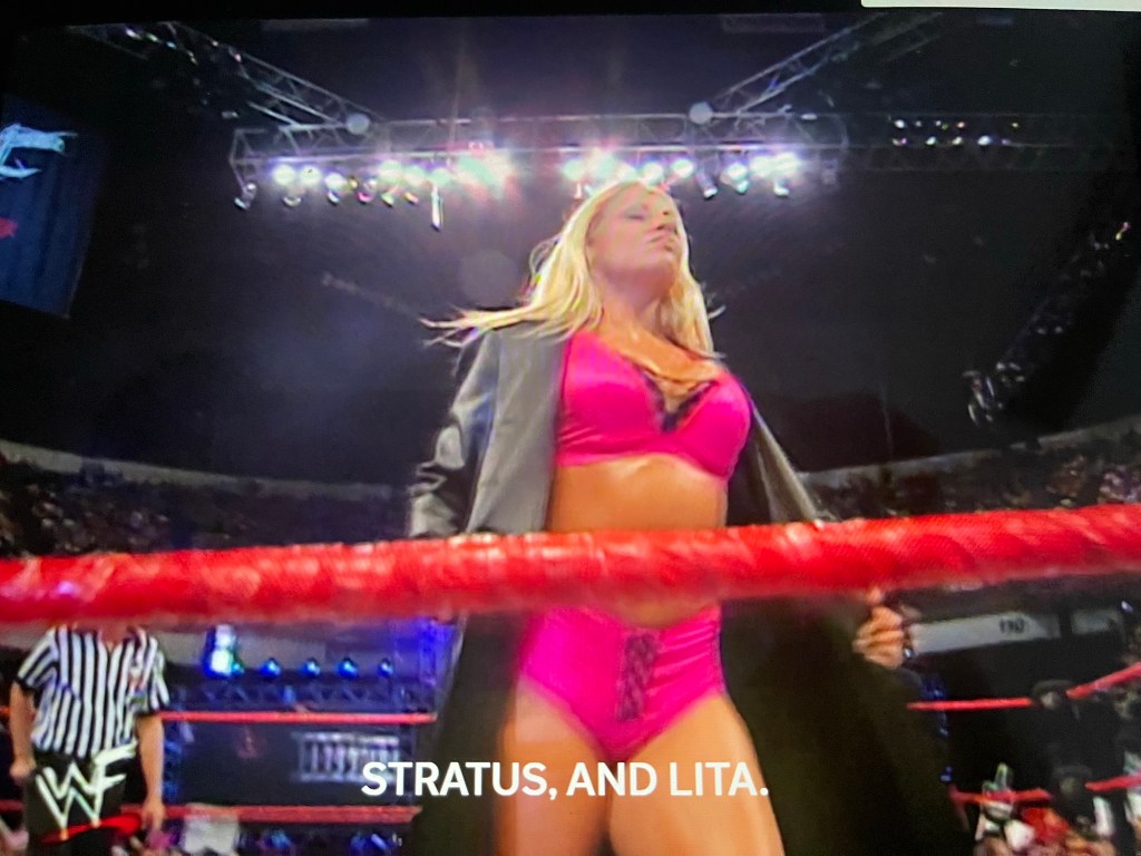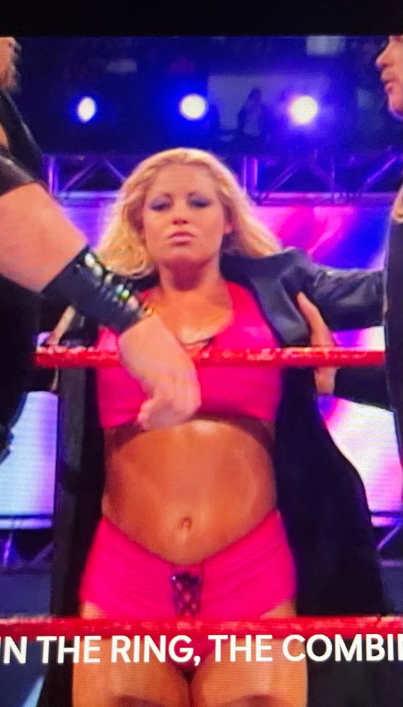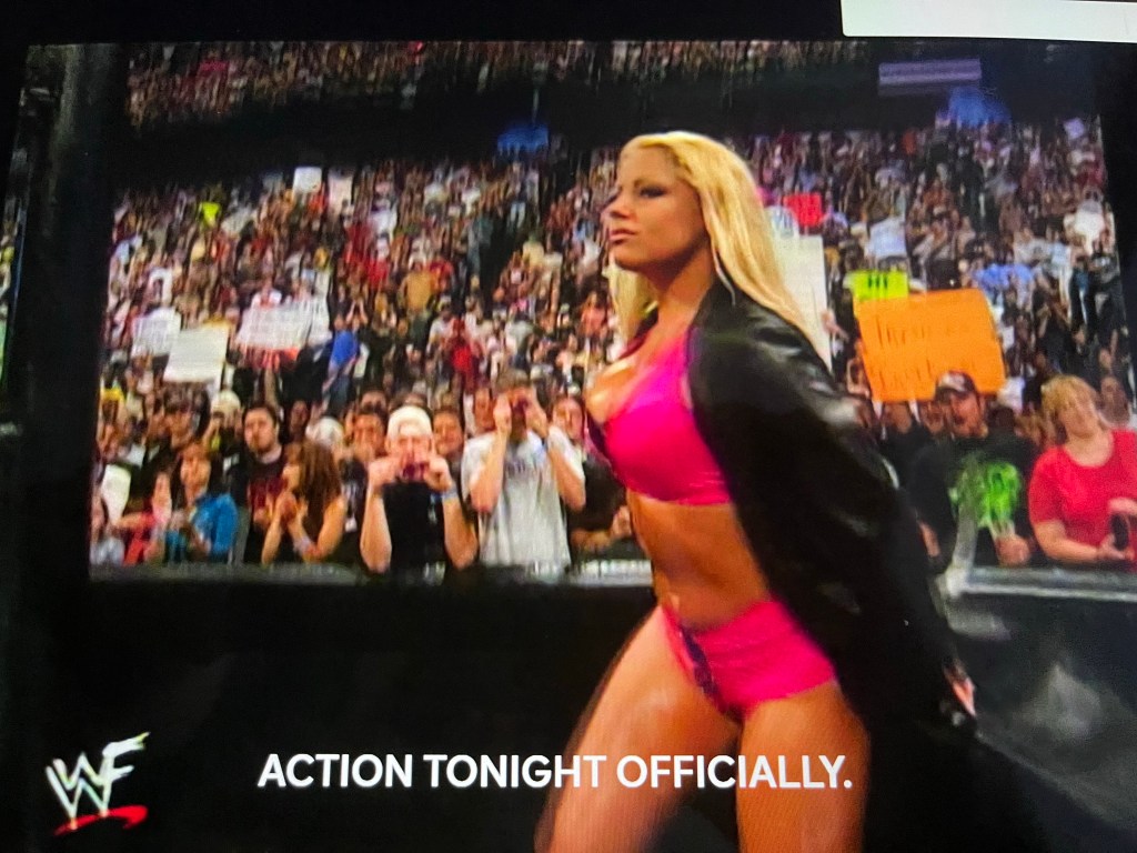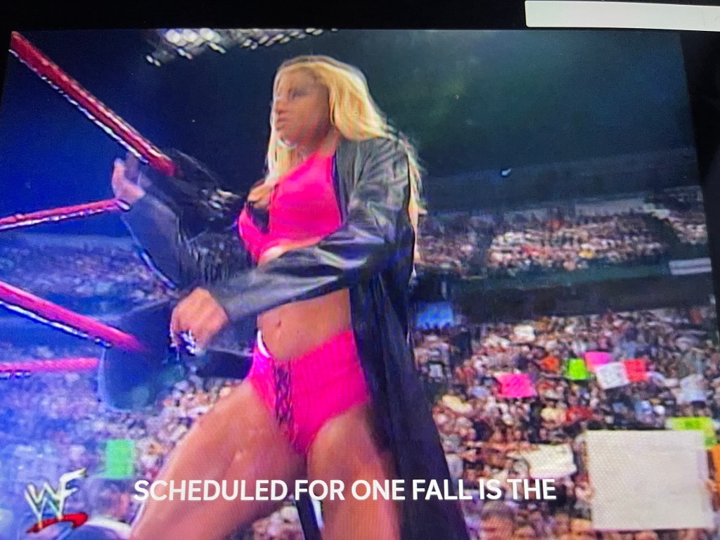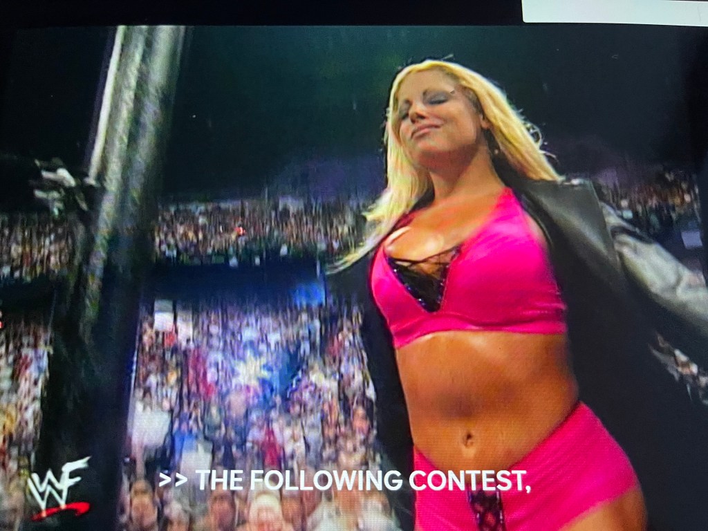 Ariande Does her best to raise her voice above the ‘boos, “And her opponent, is the current WWE Champion, if she wins tonight, she’ll have held the title for over a year, an unheard of feat,… it’s Trish Stratus!” Ariande is quick to cover her ears.