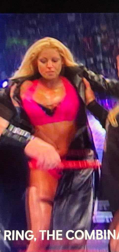 Trish plays to them one more time before relinquishing the championship to the referee. Just before the handoff she does something quite peculiar, she kisses the title before sending it on its way. (maybe it’s the last time?)