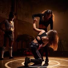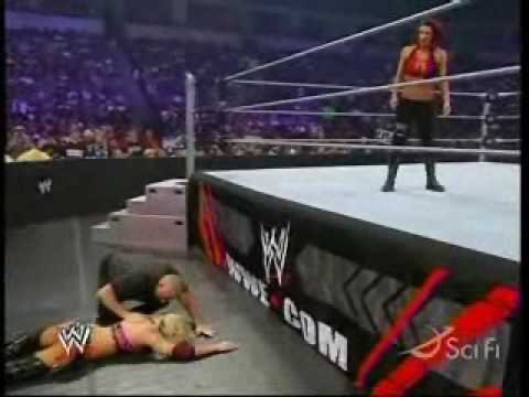 Trish rolls Kelly off of her until both women go rolling around in the ring. Until eventually they both roll out of the ring towards where Ashley is sitting.