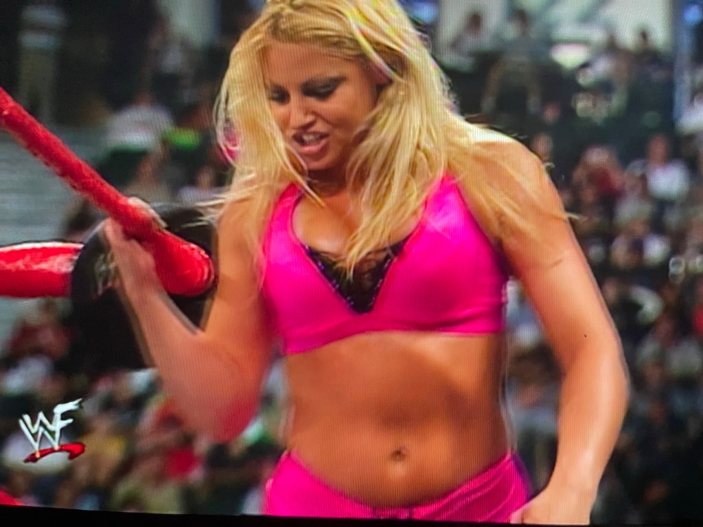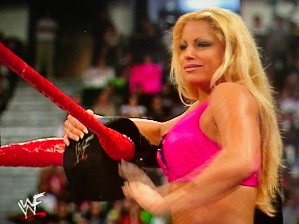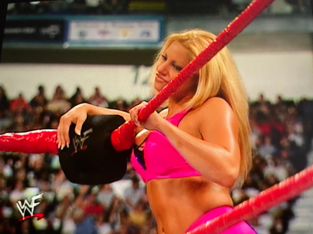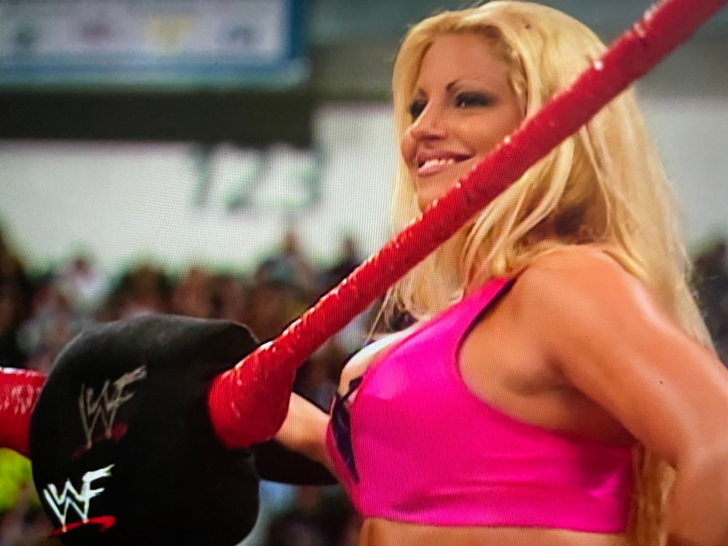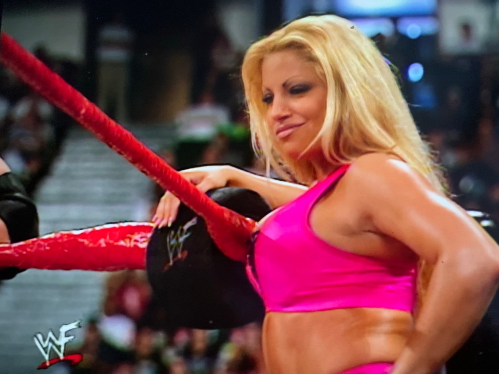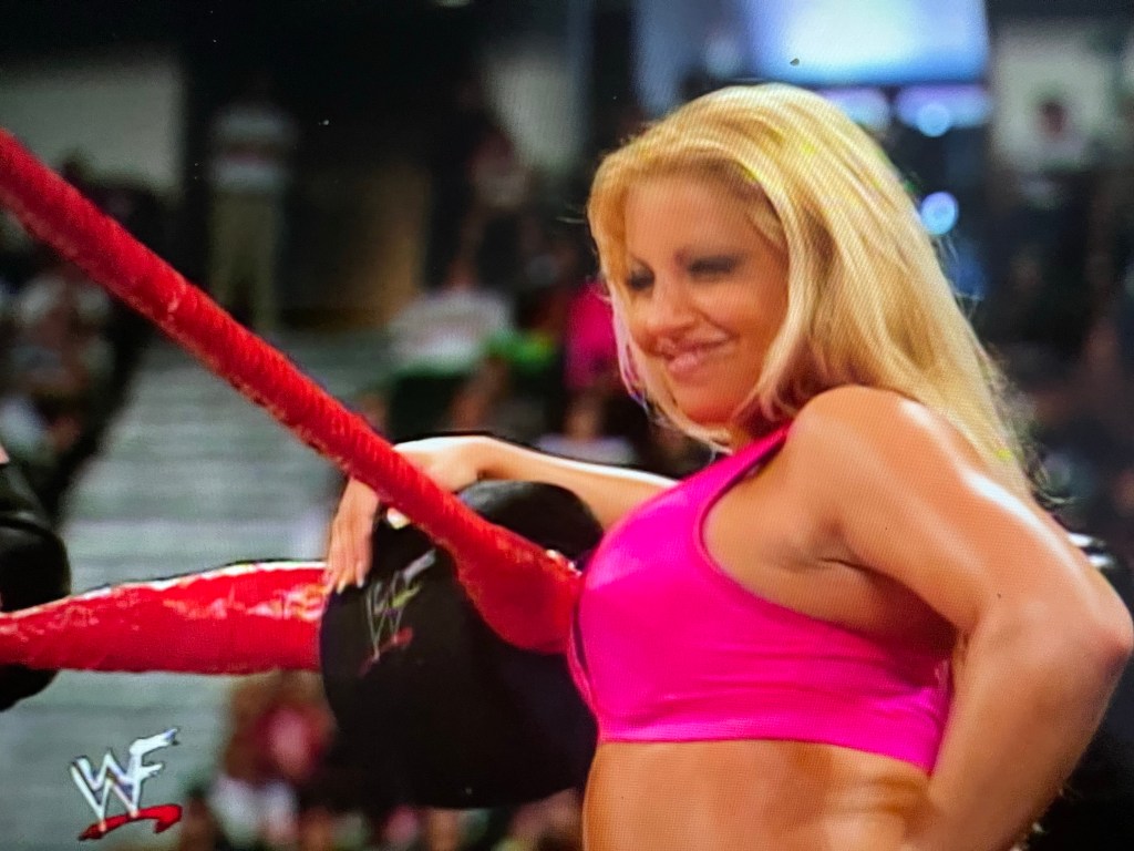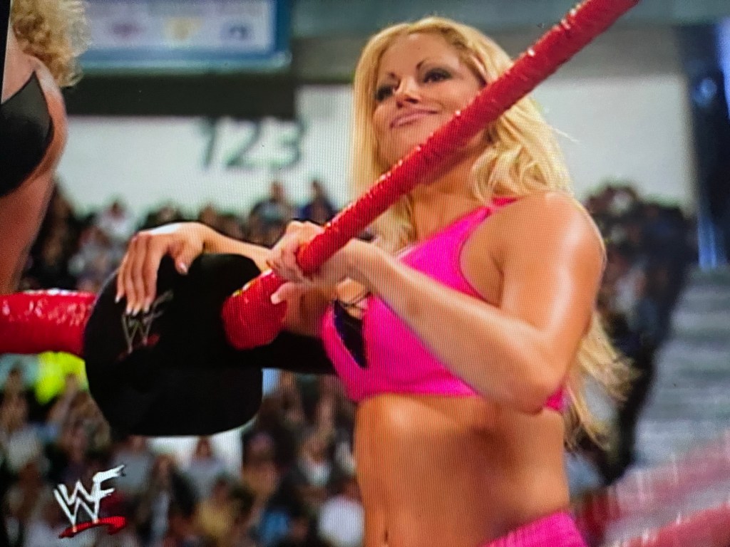 Trish hops aboard the apron, towards the corner turnbuckle. She continues keeping a close eye on Ashley. I think we both know you want me tonight. But you’re getting Kelly tonight.