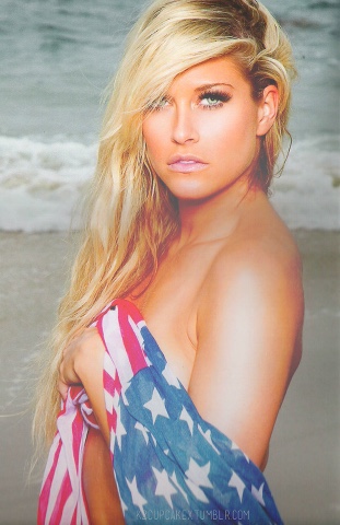 The beautiful blonde rises to her knees, before the larger woman. She holds her back with one hand. Ashley Graham stands directly in front of her. Her shadow just covers Kelly.