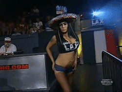 Ariel’s theme plays and she comes out to the stage. Ariel has the WWE championship around her waist. Ariel stands there almost squatting. She stands there waiting. Trish’s music hits and Trish comes out in all fours. Trish crawls in her wrestling gear towards Ariel. Trish goes through her legs and Ariel sits on Trish’s …
